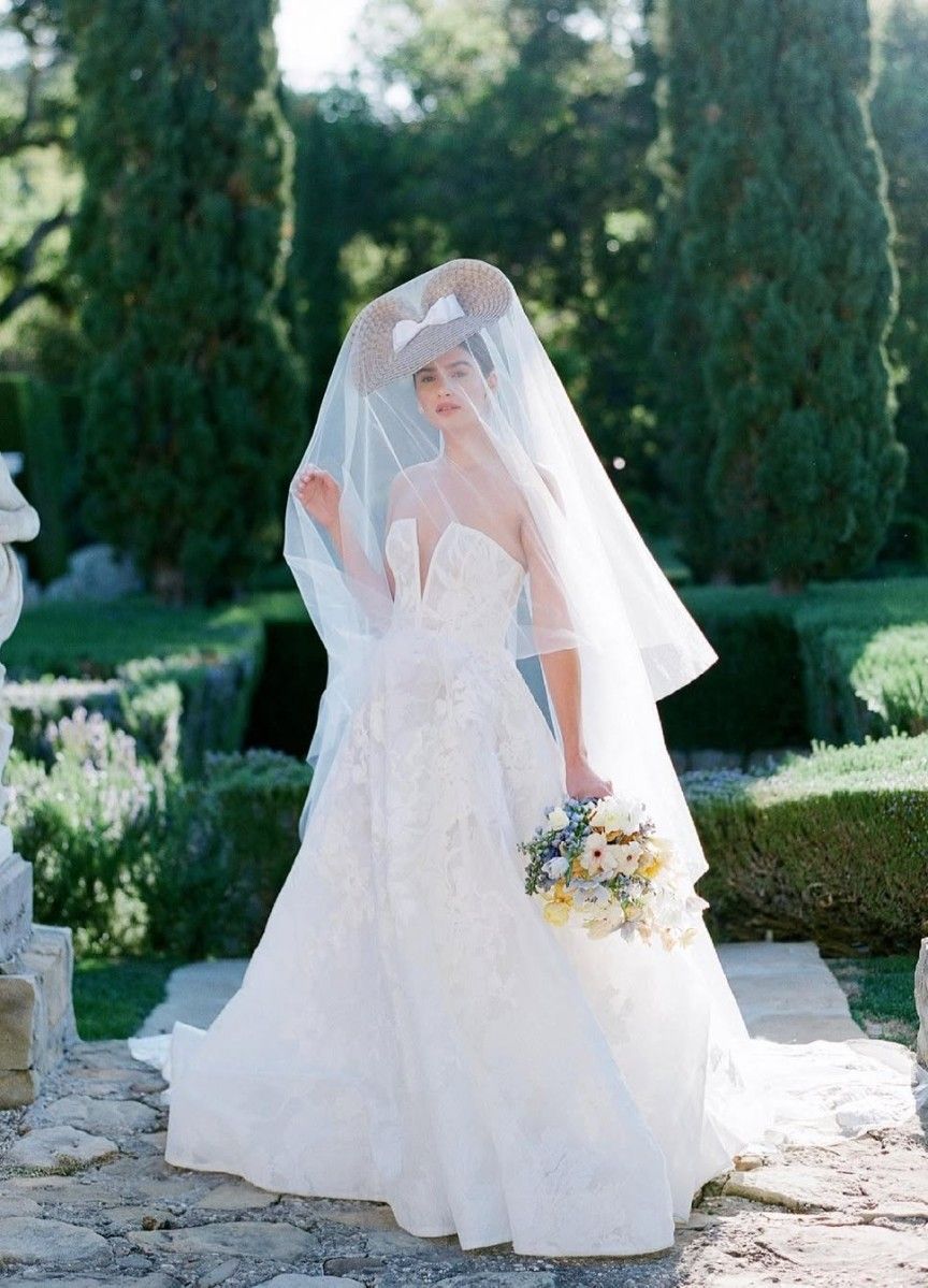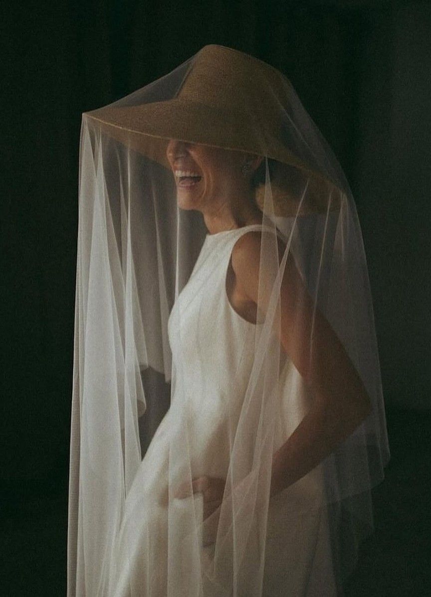 An ultra-fashionable bride layered a veil atop a dramatic straw hat for a wearable work of art.