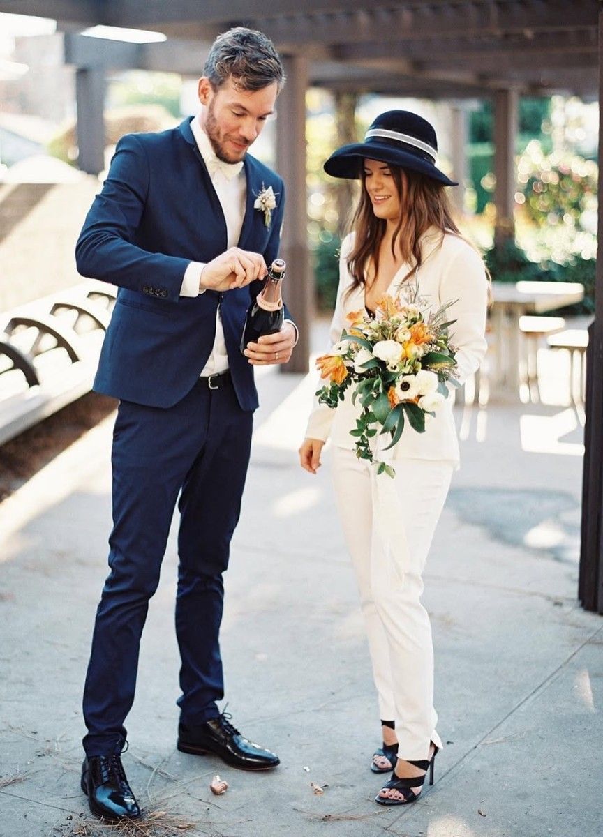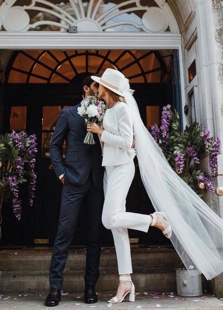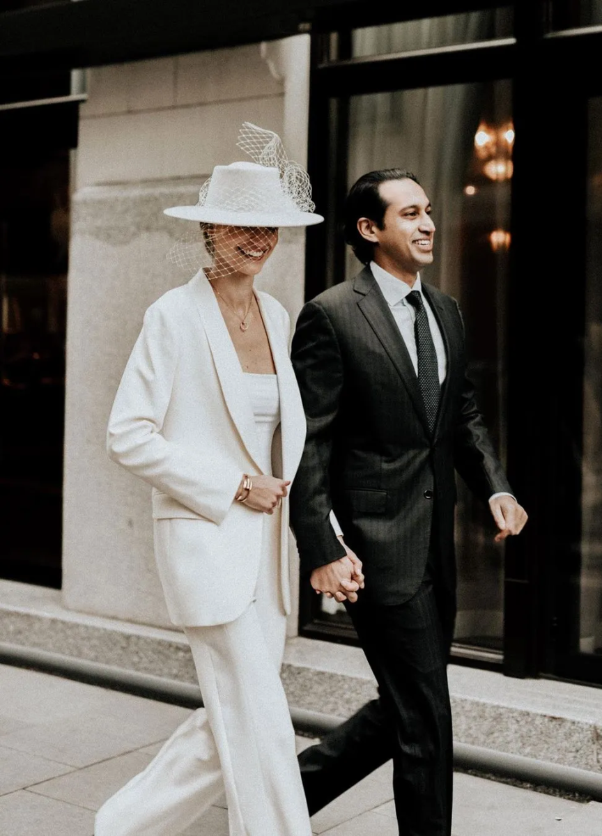 For a chic courthouse ceremony, this bride elevated her bridal suit with a sleek, tailored white wedding hat.