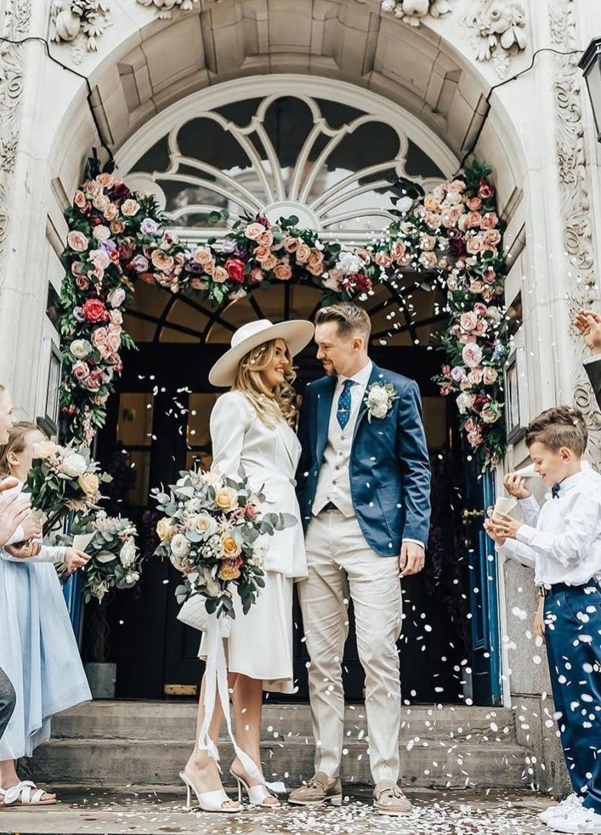 A “just married” moment from the civil ceremony is effortlessly elevated by the bride’s chic courthouse wedding hat.