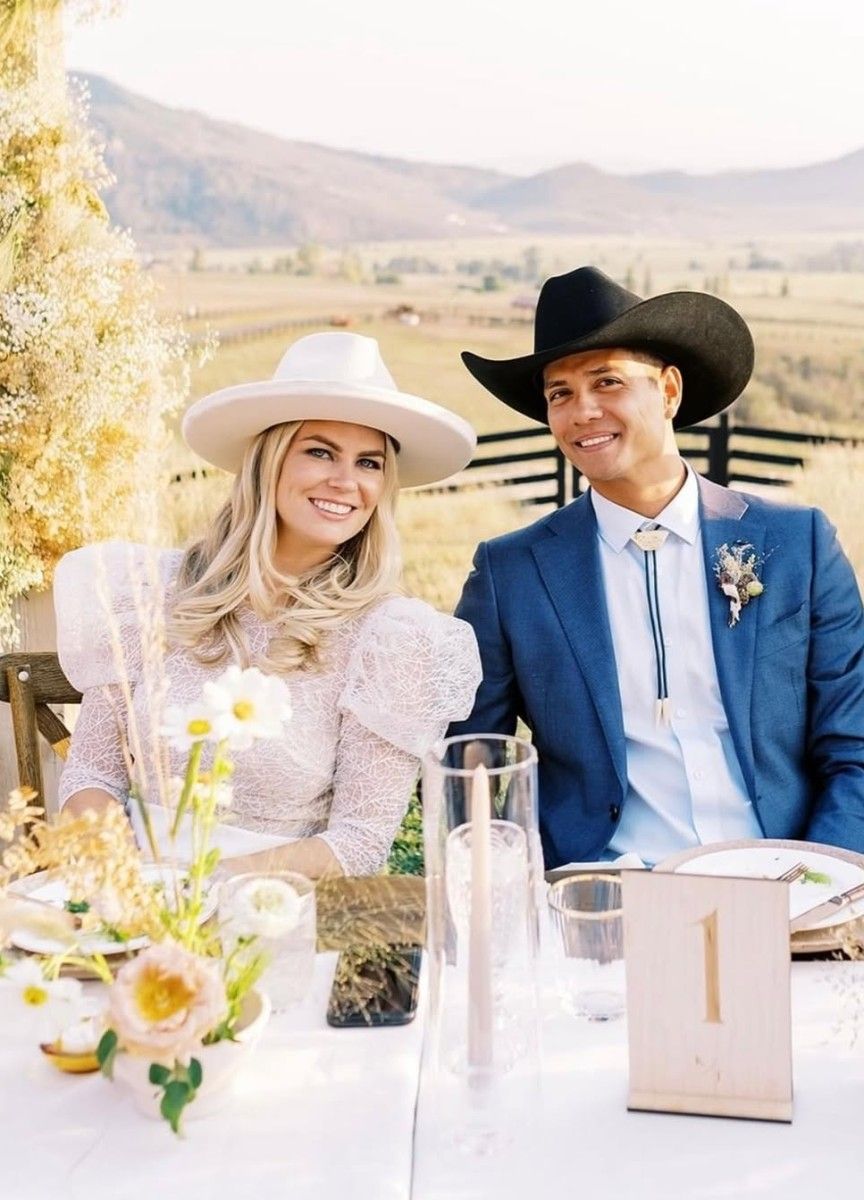 For her outdoor ranch wedding, this bride styled multiple cowboy hats—each one perfectly matched to a different look and moment of the celebration.