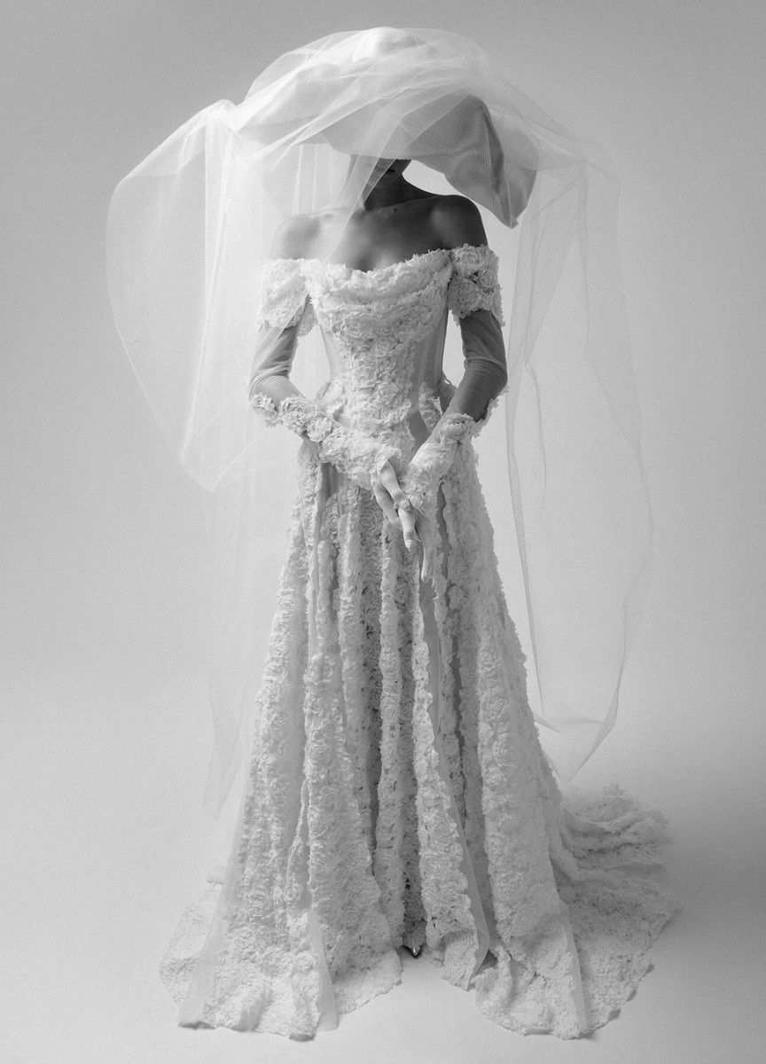 A dramatic, veil headpiece added a fashionable finishing touch to this couture ensemble.