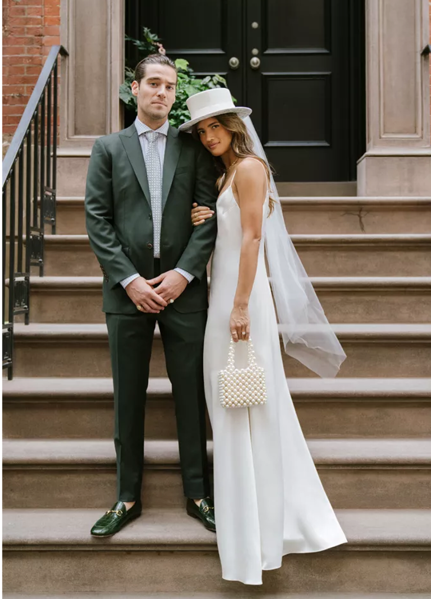 Model Rachel "Rocky” Barnes wore a classic white wedding hat for her New York rehearsal dinner.