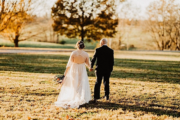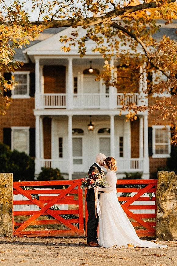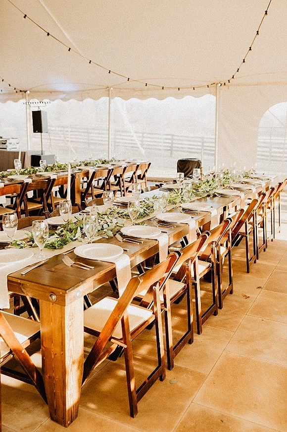 Tent, place settings, bourbon barrels, banquet tables, and linens by Reliable Rentals. Farm tables and chairs for the ceremony and reception by Southern Classic Rentals.