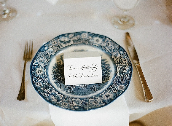 The bride and her mother collected 200 blue and white china dinner plates to honor the brideís great-great-grandmother whose blue willow china set was passed on to the bride at her bridal shower.