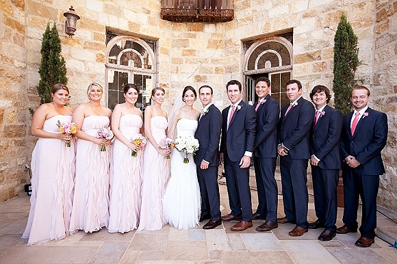 The bridesmaids wore the Strapless Crinkle Chiffon dress in blush by Vera Wang for Davidís Bridal!